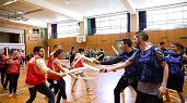 Participants use sponge swords to
